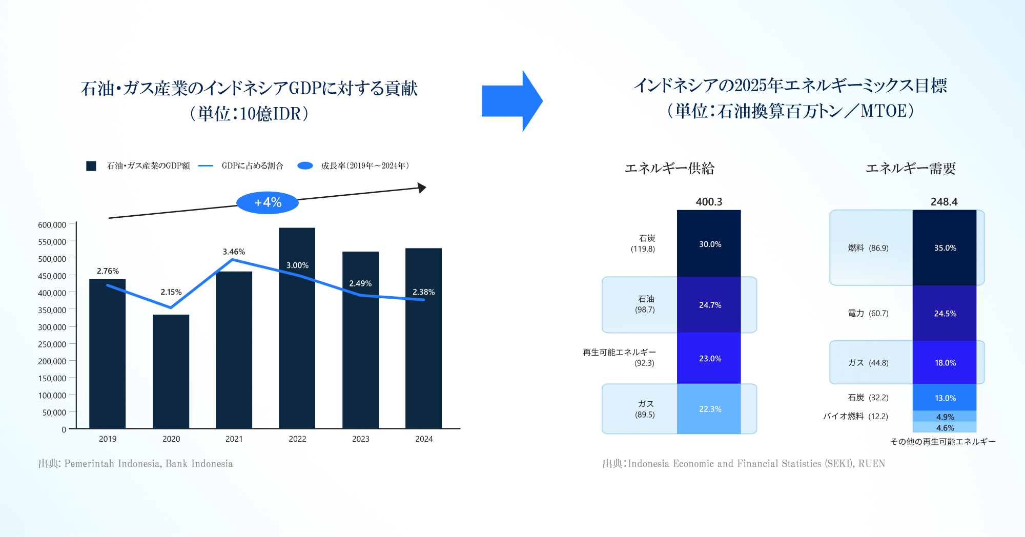 インドネシアの石油・ガス産業は、2019年の2.76%から2024年には2.38%へとGDPに占める割合が低下している一方で、産業自体は年率約4%の成長を維持しており、依然として国家経済の中核的な役割を果たしています。しかし、国内の原油生産量は製油需要に対して依然として追いついておらず、輸入依存および国際価格変動への感応度が高まっています。加えて、老朽化した埋蔵資源や低複雑度の製油設備といった構造的な課題が、バリューチェーン全体にわたる改革の必要性を浮き彫りにしています。