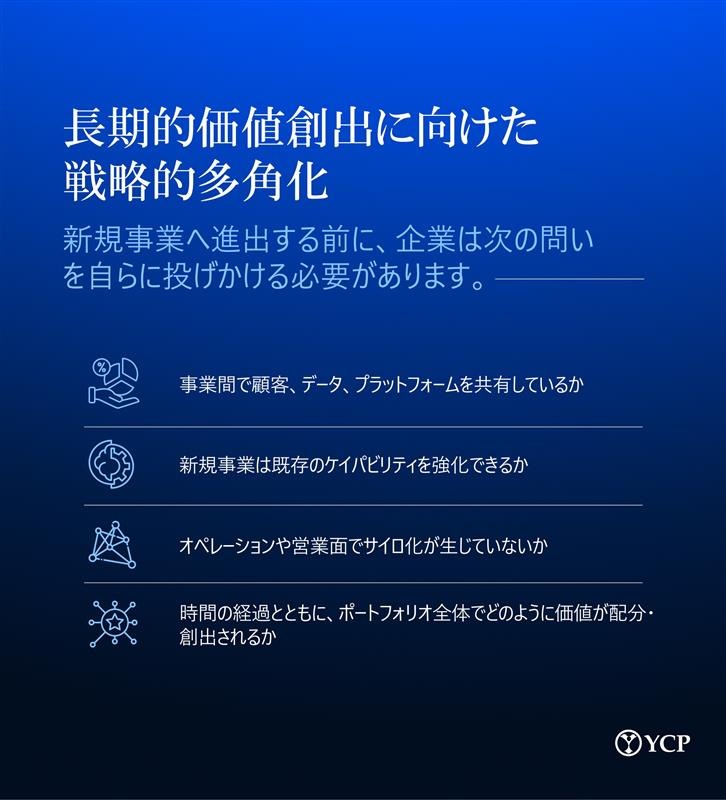 これに対し、高パフォーマンス企業は多角化を「システム構築」の取り組みとして捉えています。共有プラットフォーム、共通の顧客接点、統合的なケイパビリティ開発を優先し、YCPの多角化フレームワークが強調する規律あるポートフォリオ設計と組織内アラインメントを実践しています。こうしたシステム志向のアプローチを欠けば、十分なリソースを投じた拡張であっても、優位性ではなく複雑性の源泉となりかねません。