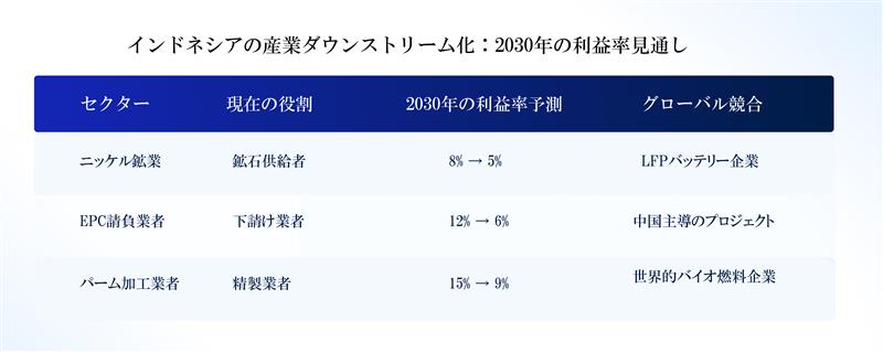 国内企業の関与が浅いままでは、産業のダウンストリーム化がかえって海外への依存構造を強化する可能性があります。主要セクターではすでに利益率の低下が進んでいます。